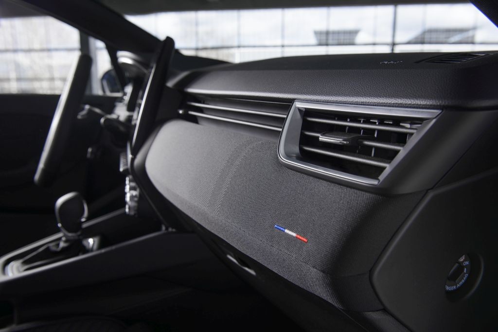 Tudi sedeži različice esprit Alpine so izdelani iz trajnostnih materialov, med katerimi sta blago z 72-odstotnim deležem recikliranih polietilenskih vlaken (PET) na sedalih in naslonih ter tkanina z zrnatim premazom na straneh s 13-odstotnim deležem recikliranih snovi. Notranjo opremo te različice dopolnjujejo še drugi elementi in podrobnosti. Volan je, na primer, posebej oblikovan, da bi povzel duha znamke Alpine. Z dvojnimi okrasnimi šivi modre, bele in rdeče barve, luknjičasto prevleko in črnim vstavkom z globokim sijajem, ki ima na sredini ledeno črn zaščitni znak, ta volan prav vabi k zagonu motorja. Tudi armaturna plošča je okrašena z izvezeno francosko zastavo, varnostni pasovi spredaj in zadaj (razen tistega na sredini) imajo modre robove, stopalke so iz aluminija in pragova prednjih vrat imata posebni oblogi. Nazadnje, ko voznik sede za volan, se na zaslonu naprave Renault Easy Link prikaže pozdravno sporočilo s posebno sekvenco dobrodošlice v duhu znamke Alpine.