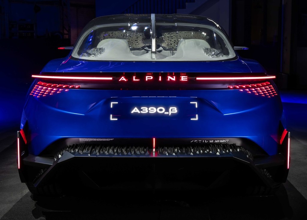 namig na dirkalnike Alpine, ki tekmujejo v Le Mansu, ter sopomenka za fluidnost in stabilnost. Na koncu, v skladu z difuzorjem zadaj se osvetljen pas lahko iztegne ali umakne nazaj za 80 mm, s čimer se A390_β preobrazi iz avtomobila s kratkim zadkom (»short-tail«) v takšnega z dolgim (»long-tail«). Ta zmožnost podaljšanja zmanjšuje koeficient zračnega upora in izboljša doseg vozila.