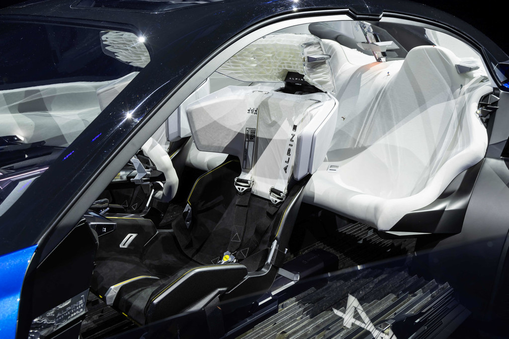 Vzglavniki so izdelani s trirazsežnostnim tiskom francoskega podjetja Erpro Group, ki je vodilno na tem področju in razvija vrhunske prototipe za avtomobilsko in aeronavtično industrijo ter za panogi oblikovanja in luksuznih izdelkov. Za vzglavnike so uporabili elastomer biološkega izvora Pebax® Rnew® podjetja Arkema, ki je delno izdelan iz ricinusovega semena. Enako kot razstavni prototip bo tudi kasnejši serijski model imel akustično arhitekturo, ki jo bodo po meri zasnovali in razvili v podjetju Devialet, in bo zagotavljala ultra-vrhunske zvočne lastnosti ter pri potnikih ustvarila vtis, da se vozijo v snemalnem studiu. Ta zvočni sistem bo okrepil sistem ADS, Alpine Drive Sound, ki iz alikvotnih tonov elektromotorja poustvarja športen zvok ter ga predvaja vozniku in potnikom. Obstoječe sodelovanje s podjetjem Michelin bo omogočilo, da bo serijsko vozilo opremljeno s pnevmatikami, ki bodo razvite skupaj z Alpine in bodo zagotavljale edinstveno vozno izkušnjo, posebej za A390.