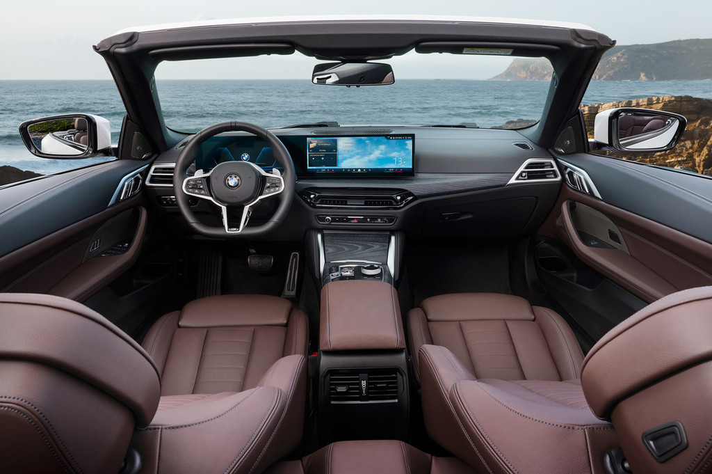 Občutek modernega športnega avtomobila v notranjosti z ukrivljenim zaslonom BMW, že standardni športni sedeži in na novo zasnovan volan. Standardni volan in M usnjen volan imata raven spodnji del. Prestavne ročice na volanih so zdaj tudi del standardne specifikacije. Novi BMW serije 4 Coupé in novi BMW serije 4 Cabrio sta standardno opremljena s perforiranimi sedežnimi prevlekami Sensatec. Opcijsko usnje Vernasca z okrasnim prešitjem zdaj na voljo tudi v dvobarvni črno-rdeči različici. Na razpolago je tudi usnje BMW Individual Merino v treh barvah. M Performtex zdaj prvič nastopa kot bolj trajnosten alternativni material za prevleke sedežev novega BMW serije 4 Coupé. Visokokakovosten velurju podoben material v črni barvi na voljo izključno v vozilih, opremljenih s paketom M Sport, in v modelih M Performance.