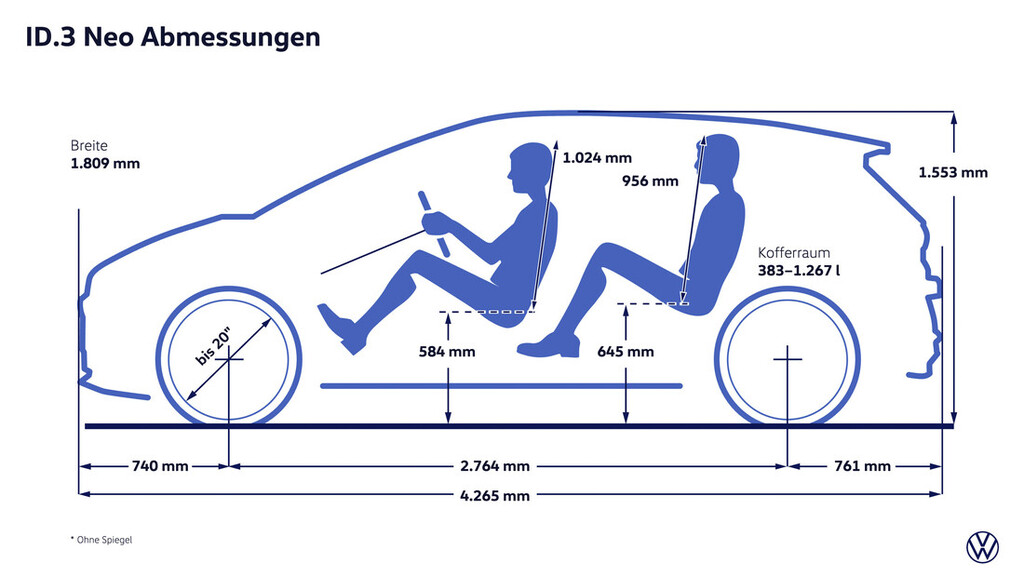 Nova prečiščena podoba. Zunanjost modela ID.3 Neo sledi načelu "True Volkswagen", kar se jasno odraža v prenovljenem sprednjem delu z neprekinjenim svetlobnim pasom in osvetljenim logotipom. Zasnova izhaja iz Volkswagnovega oblikovalskega sloga "Pure Positive", ki ga je opredelil Andreas Mindt, glavni oblikovalec znamke in koncerna. Streha, zadnji usmernik zraka in pokrov prtljažnika so – tako kot pri klasičnih Volkswagnovih kompaktnih modelih – lakirani v barvi karoserije, zaradi česar je ID.3 Neo videti daljši, nižji in bolj dinamičen.