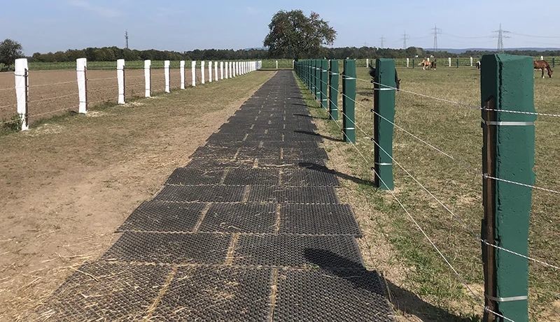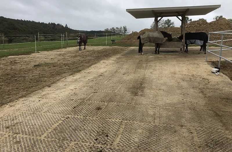 Blato in luže na izpustih so pogosta težava, ki ogroža zdravje konj (kopita, sklepi) ter otežuje vsakodnevno oskrbo. HIT pohodne plošče iz gume rešujejo ta izziv z učinkovito drenažno in utrditveno rešitvijo. Gre za robustne talne rešetke iz reciklirane plastike, ki jih položimo na izpuste ali sprehajalne poti. Rezultat je stabilna, suha in nedrseča podlaga, na kateri se konji lahko varno in sproščeno gibljejo v vsakem vremenu . Kvalitetno urejena površina namreč pomembno vpliva na dobro