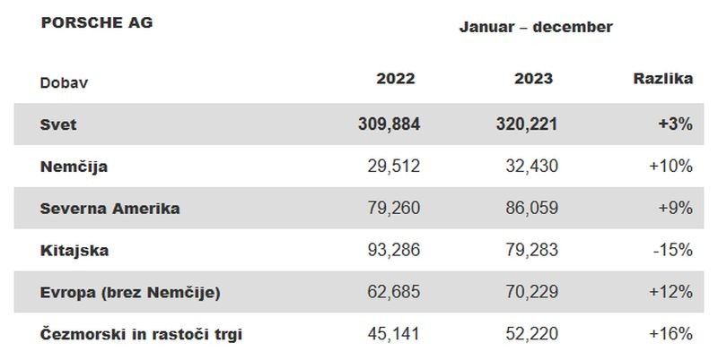 Stuttgart (Nemčija). Znamka Porsche je v poslovnem letu 2023 zabeleži stabilno rast in rahlo povečanje obsega dobav. Proizvajalec športnih avtomobilov je v zadnjih dvanajstih mesecih skupno dobavil 320.221 vozil. To je 3 odstotke več kot leta 2022. "Naša znamka ostaja zaželena in ekskluzivna tudi v negotovih časih svetovnega gospodarstva," je povedal Detlev von Platen, direktor prodaje in