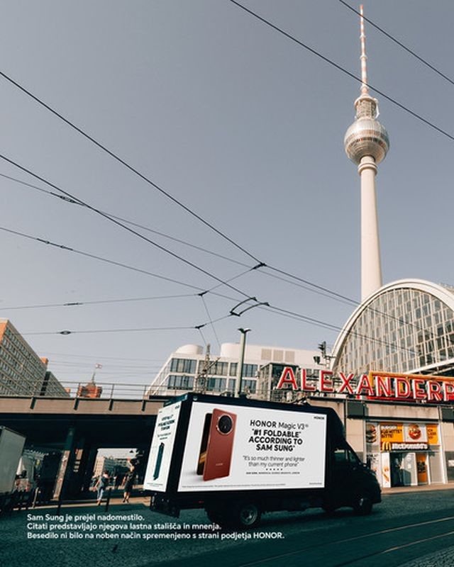 To ne preseneča, saj je HONOR Magic V3 izjemen odprt meri le 4,35 mm, zaprt pa 9,2 mm, tehta le 226 g in tako na novo definira prenosno tehnologijo. Ob praznovanju teh priznanj je HONOR začel turnejo po ulicah Berlina z mobilnim plakatom, okrašenim s citati Samov Sungov. Strateška pot oglasnega plakata je vključevala ikonične znamenitosti.