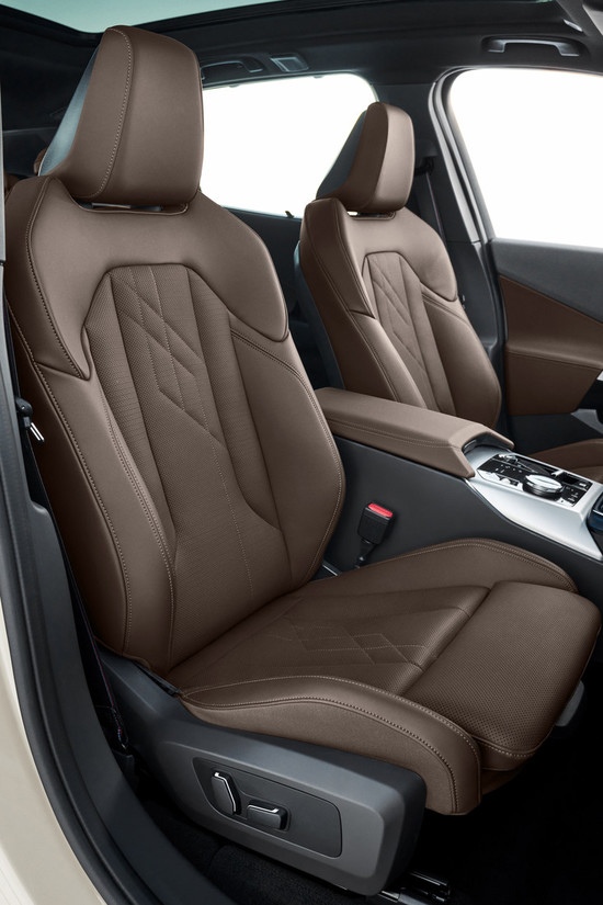 Osvežena interpretacija oblikovanja notranjosti, značilne za modele BMW X. Osupljiva geometrija s homogenimi površinami in skoraj neprekinjenim oblikovanjem armaturne plošče ter obloge na vratih, ki obdaja voznika in potnike Ukrivljeni zaslon BMW z 12,3-palčno instrumentno ploščo in 14,9-palčnim nadzornim prikazovalnikom, BMW Interaction Bar, novi volani z ravnim dnom ter nova prestavna ročica. Nadzorne plošče in zračniki v sprednjem delu obloge na vratih so obrobljene s sodobnimi svetlobnimi elementi v kontrastni barvi. Držala za pijačo z na novo interpretiranim odlagalnim prostorom, vključno s funkcijo brezžičnega polnjenja v sredinski konzoli. Notranjost s sedežnim prevlekami iz materiala Econeer, oblazinjenja iz reciklabilne sekundarne surovine, je standardna. Opcijsko je na voljo perforirano oblazinjenje Veganza v videzu sintetičnega usnja v treh barvah; oblazinjenje BMW Individual iz usnja Merino (prav tako opcijsko) pa je na voljo v dveh barvah. Oblazinjenje v kombinaciji Veganza/Alcantara je del paketa M Sport. Opcijska armaturna plošča Luxury, ki je zdaj prvič izdelana iz recikliranega poliestra, se ponaša z visokokakovostno pleteno teksturo.