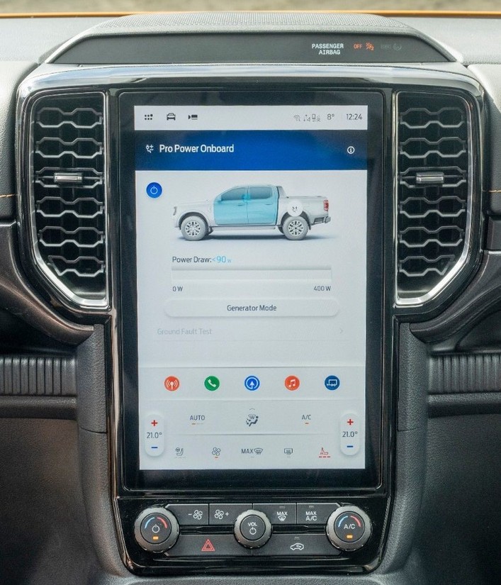 “Ranger PHEV nam je omogočil, da smo zagotovili še večjo uporabnost najbolje prodajanega pickupa v Evropi,” pravi James Cooper, vodja za model Ranger, Ford Evropa. Na voljo sta dve izhodni moči – 2,3 kW ali 6,9 kW –, ki sta porazdeljeni na tri 230-voltne vtičnice. Zmogljivejši sistem za Forda Rangerja PHEV z močjo 6,9 kW ima dve vtičnici v tovornem prostoru (15 A in 3,45 kW na vtičnico), ki izpolnjujeta zahteve za napajanje opreme z večjim odjemom. Sistem Pro Power Onboard je na voljo v dveh različicah z močjo 2,3 kW ali 6,9 kW, moč pa je porazdeljena na tri 230-voltne vtičnice, od katerih je ena v zadnjem delu kabine za potnike. Zmogljivejši sistem z močjo 6,9 kW ima eno vtičnico v zadnjem delu kabine za potnike in dve vtičnici v tovornem prostoru (15 A in 3,45 kW na vtičnico), ki izpolnijo vse zahteve za napajanje opreme z večjim odjemom. Upravljanje sistema Pro Power Onboard poteka prek sistema za informacije in razvedrilo SYNC 4 v Rangerju PHEV, poraba energije priključenih naprav pa je prikazana na zaslonu na dotik.