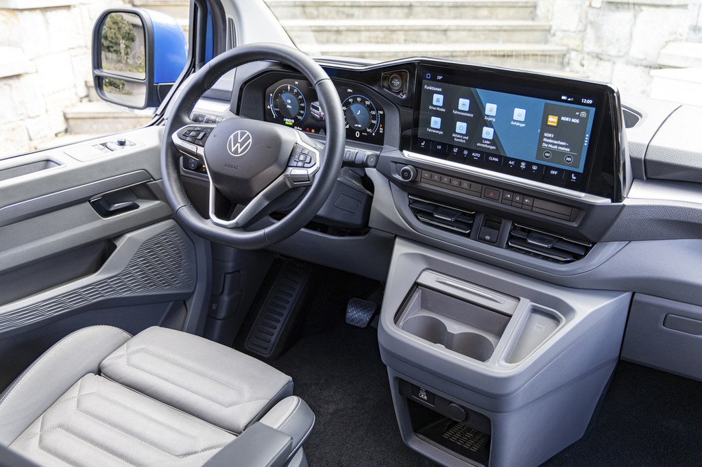 Ergonomsko delovno mesto z najsodobnejšo tehnologijo: Volkswagen Gospodarska vozila na novi zasnovi armaturne plošče modelov Transporter in Caravelle povezuje digitalni svet zaslonov in upravljalnih elementov ter robustne klasične tipke, tako da je za profesionalce uporaba obeh vozil v vsaki situaciji enostavna in varna. To vključuje tudi integracijo različnih USB-priključkov in 12-voltnih vtičnic ter – opcijsko – ene oz. do treh (pri priključnohibridnih in električnih modelih) 230-voltnih vtičnic.