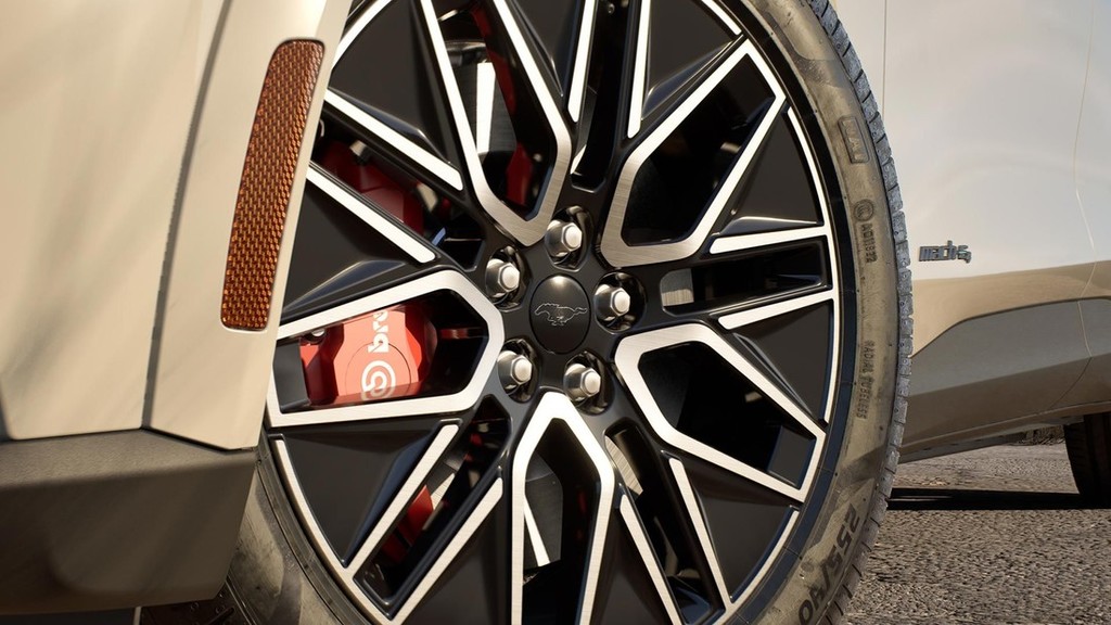 Mustang Mach-E modelnega leta 2025 ima izrazito osebnost tudi v eni od treh živahnih novih zunanjih barv: Velocity Blue, Molten Magenta in Terrain. Spredaj je dodan eleganten, črno lakiran razdelilnik, model GT pa odlikuje tudi nova športna črna sprednja maska. Udarna platišča iz lahke zlitine so še dostopnejša, saj so osnovne različice zdaj opremljene s platišči, ki so bila prej ekskluzivna za izvedbe Premium, modeli Premium pa so za doplačilo na voljo z 48,3 cm (19''), črno lakiranimi platišči iz lahke zlitine, ki poskrbijo za res drzen videz.