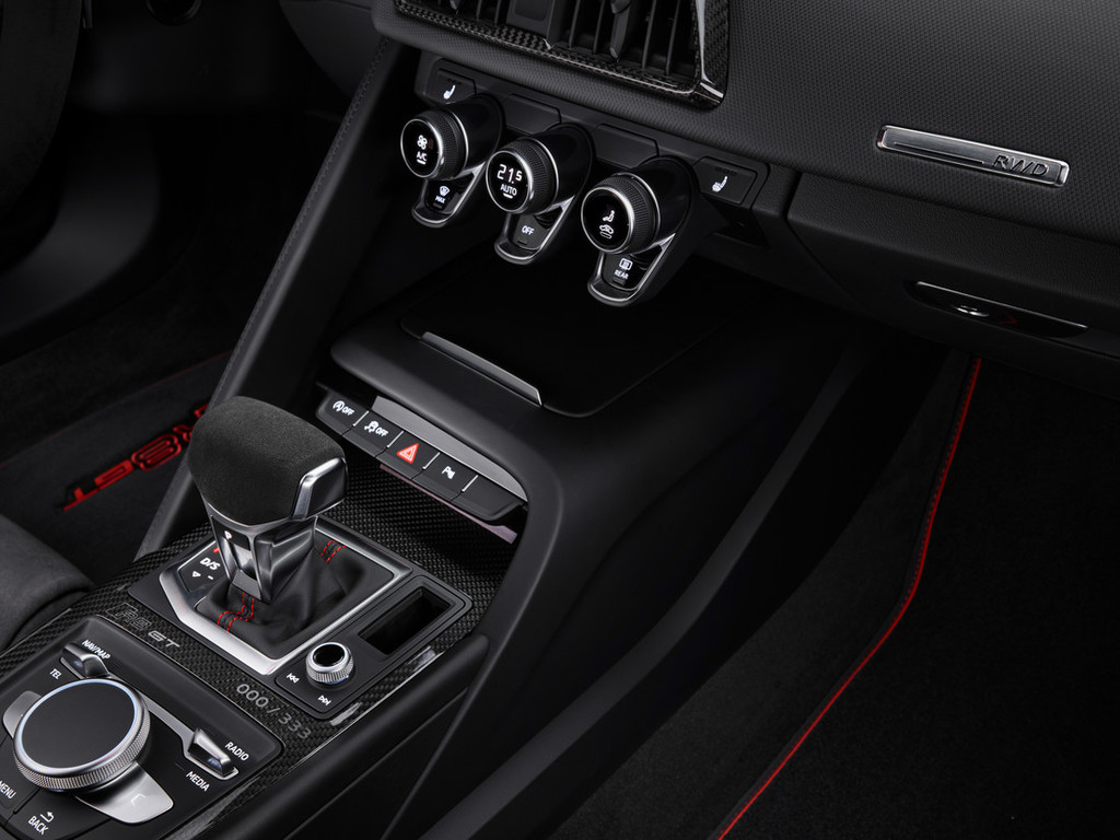 spremenjenim prestavnim razmerjem in s tem višjim nivojem števila vrtljajev novi menjalnik omogoča še bolj osupljivo pospeševanje v vseh prestavah. Kot optični poudarek pri V10 je sesalni kolektor različice R8 GT izveden v ekskluzivni bleščeče črni barvi.