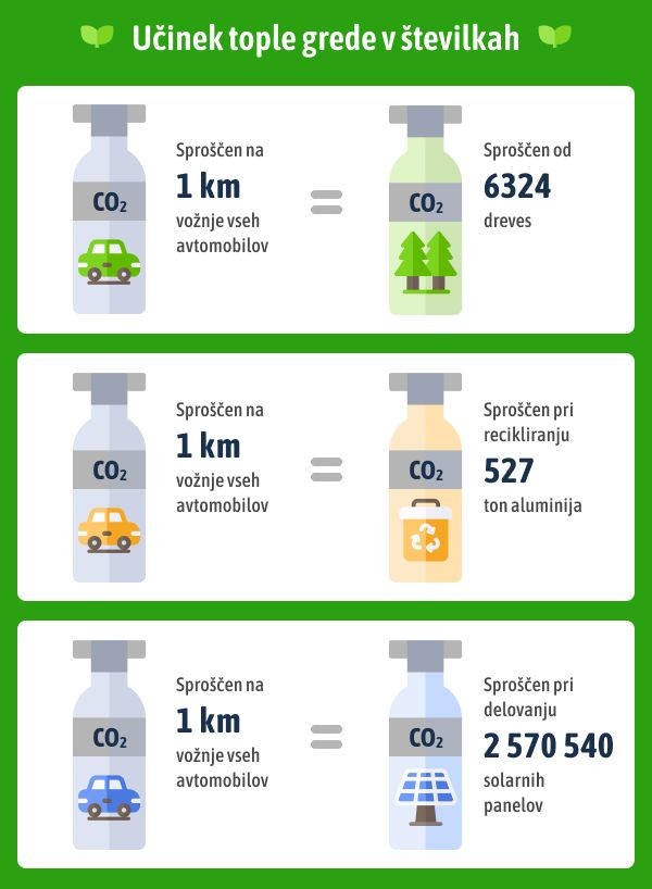 Ista količina CO2, kot jo proizvedejo vsi avtomobili v Sloveniji, bi bila proizvedena tudi s 6,324 drevesi. To primerjanje kaže, koliko prostora v atmosferi bi sprostili za naravne procese, ki prav tako proizvajajo CO2, vendar so koristnejši za okolje. Prav tako bi isto količino CO2 proizvedlo recikliranje 527 ton aluminija, kar je proces pomemben za ohranjanje virov in zmanjševanje odpadkov. Še en primer je delovanje 2,570,540 solarnih panelov, ki bi prav tako rezultiralo v isti količini emisij CO2, vendar s koristnim izidom proizvodnje obnovljive energije. Vizija Slovenije brez avtomobilov za eno leto je več kot utopija; to je spodbuda za preizpraševanje naših prevoznih navad. Čeprav popolna zamenjava osebnih avtomobilov z javnim prevozom ni realna, lahko celo majhne spremembe prinesejo velike koristi, od zmanjšanja emisij CO2 do tišjih in čistejših mest. Ta scenarij poudarja pomembnost javnega prevoza pri ustvarjanju trajnostne prihodnosti in nas spodbuja k korakom proti temu cilju, s čimer izboljšujemo kakovost življenja na našem planetu.
