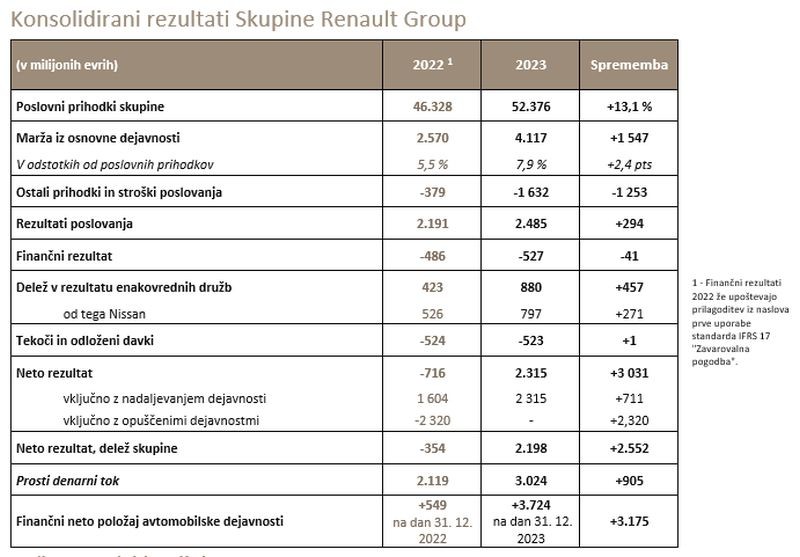 »Danes Renault Group objavlja svoje rekordne rezultate, ki so plod izjemnega dela vseh ekip in izražajo uspeh naše strategije Renaulution. Še nikoli doslej naši temelji niso bili tako trdni in zagotovo se ne bomo ustavili tukaj. Leta 2024 bomo predstavili največje število novih vozil v enem letu doslej. Ta vozila kažejo na obnovo palete vozil Renault Group, nadaljevali pa bomo tudi z optimizacijo strukture stroškov. Istočasno močno in z neverjetno hitrostjo spreminjamo Skupino, dosegamo glavne etape v naših najpomembnejših projektih ter pospešujemo strategijo na področju elektrike in programske opreme. Naša organizacija postaja vse bolj prilagodljiva in učinkovita, kar izraža posebno moč v okolju, polnem izzivov. Za tako dobre rezultate bi se rad zahvalil vsem sodelavcem. Vsi skupaj namreč prispevamo k preporodu Renault Group, ki je učinkovitejši in uspešnejši ter ustvarja vrednost pri vseh svojih deležnikih,« je izjavil Luca de Meo, izvršni direktor Renault Group.