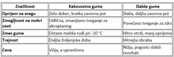 Razlike med kakovostnimi in slabšimi pnevmatiki ne moremo prepoznati le po ceni. Kakovostne zimske pnevmatike imajo boljšo zmes gume, zaradi česar so gume prožne tudi pri nižjih temperaturah. Dobre pnevmatike imajo tudi bolj agresiven profil, ki bolj učinkovito odvajajo sneg in vodo.