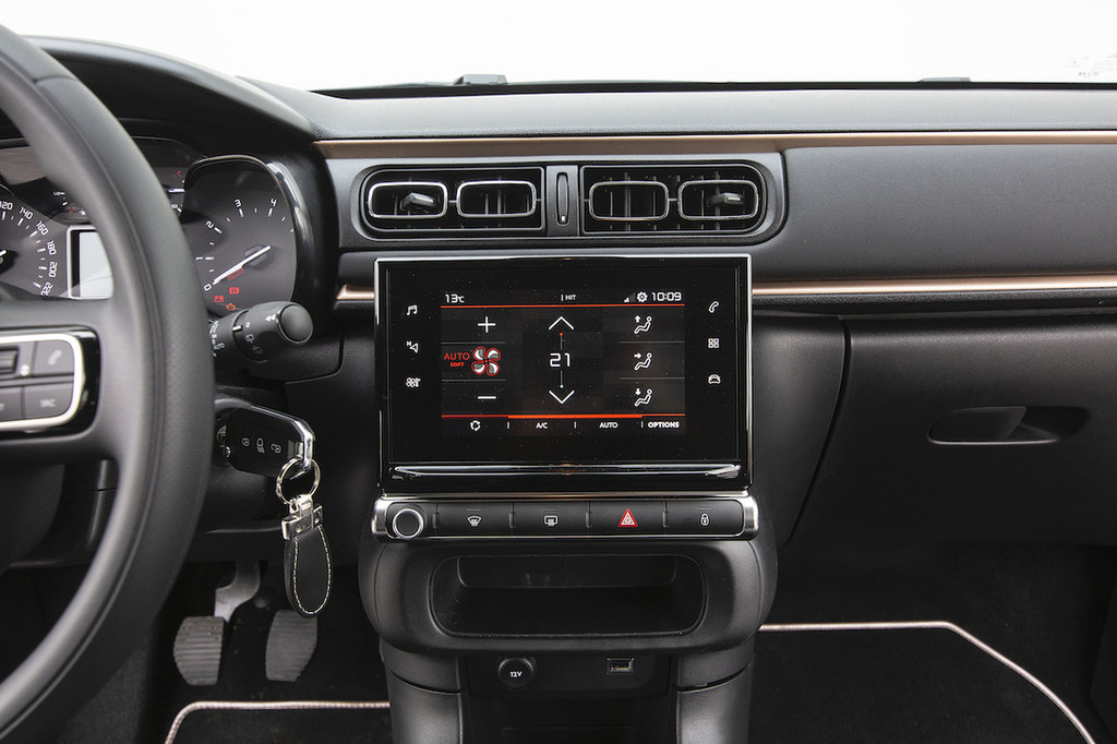 K občutku kakovosti je pri testnem avtomobilu prispevalo opcijsko usnje na volanskem obroču, za katerega je treba doplačati 150 evrov. V serijski opremi najdemo še multimedijsko napravo s 17,8-centimetrskim (7-palčnim) zaslonom na dotik, prek katerega med drugim upravljamo samodejno klimatsko napravo.
