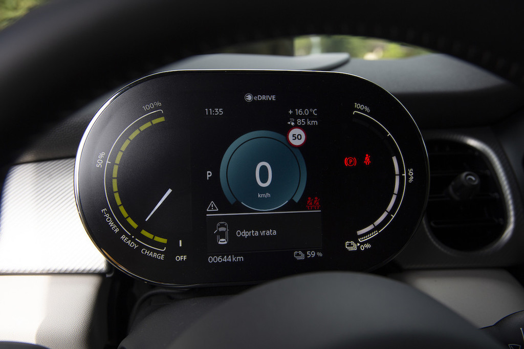Tehnika pod pločevino namreč ostaja enaka kot pred prenovo. To pomeni, da električnega minija poganja elektromotor, ki razvije 135 kilovatov (184 KM) in 270 Nm. To je dovolj za pospešek do stotice v 7,3 sekunde, pri čemer je zaradi takojšnjega navora zelo poskočen zlasti od 0 do 60 kilometrov na uro, saj do tja potrebuje le 3,9 sekunde. Enaka je tudi baterija, ki je zato, da ne bi vplivala na značilne dinamične vozne lastnosti, razmeroma majhna in sprejme le 28,9 kilovatne ure električne energije. To žal napoveduje razmeroma majhen doseg. Na testu smo v mestu dosegli porabo slabih 15 kilovatnih ur na 100 kilometrov, ob bolj dinamični vožnji in na avtocesti pa približno 20.