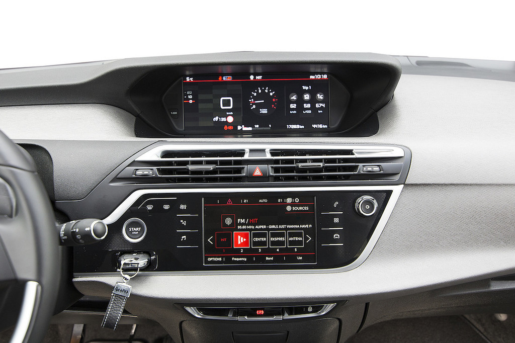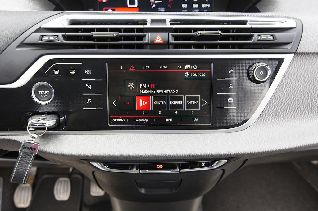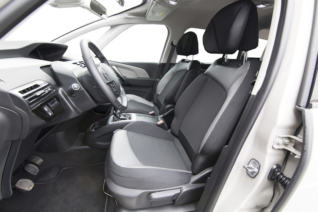 Testni avtomobil je bil opremljen z ravno prav bogato založenim paketom opreme feel (srednja možnost) in nekaj doplačilnimi dodatki, med katerimi velja, poleg varnostnega paketa, omeniti še ambientalni paket – ta ob nekaterih estetskih in drugih dobrotah med drugim poskrbi za dodatno udobje, saj prinaša masažo sprednjih sedežev, dodaten počivalnik za noge za sovoznika in zajetne vzglavnike, ki glavi nudijo zelo dobro oporo (skoraj kot v pravem fotelju), a zato krnijo preglednost "nazaj čez ramo". Škoda, saj je sicer preglednost dobra, veliko vetrobransko steklo pa se razteza daleč v streho in s tem še povečuje občutek prostornosti tega Citroënovega enoprostorca.