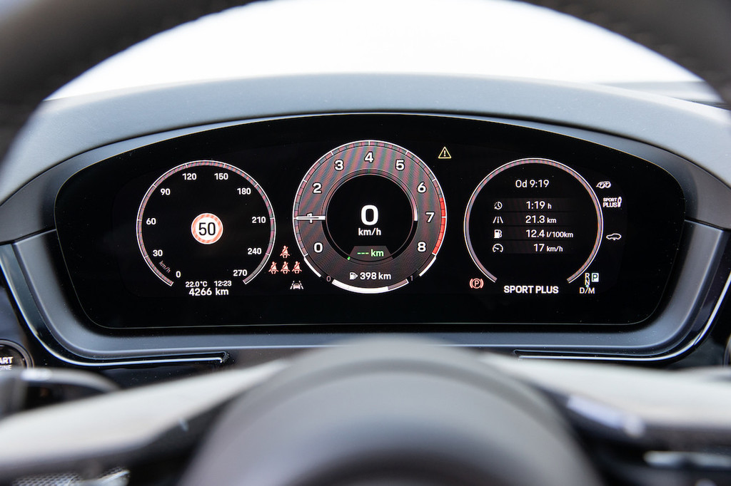 osrednji večji in prikazuje motorne vrtljaje. Skoraj enako velik, a z malce drugačnim razmerjem stranic je 31,2-centimetrski osrednji zaslon multimedijske naprave. Ne le da je pregleden in ima zelo intuitivno logiko upravljanja, je tudi bliskovito hiter.