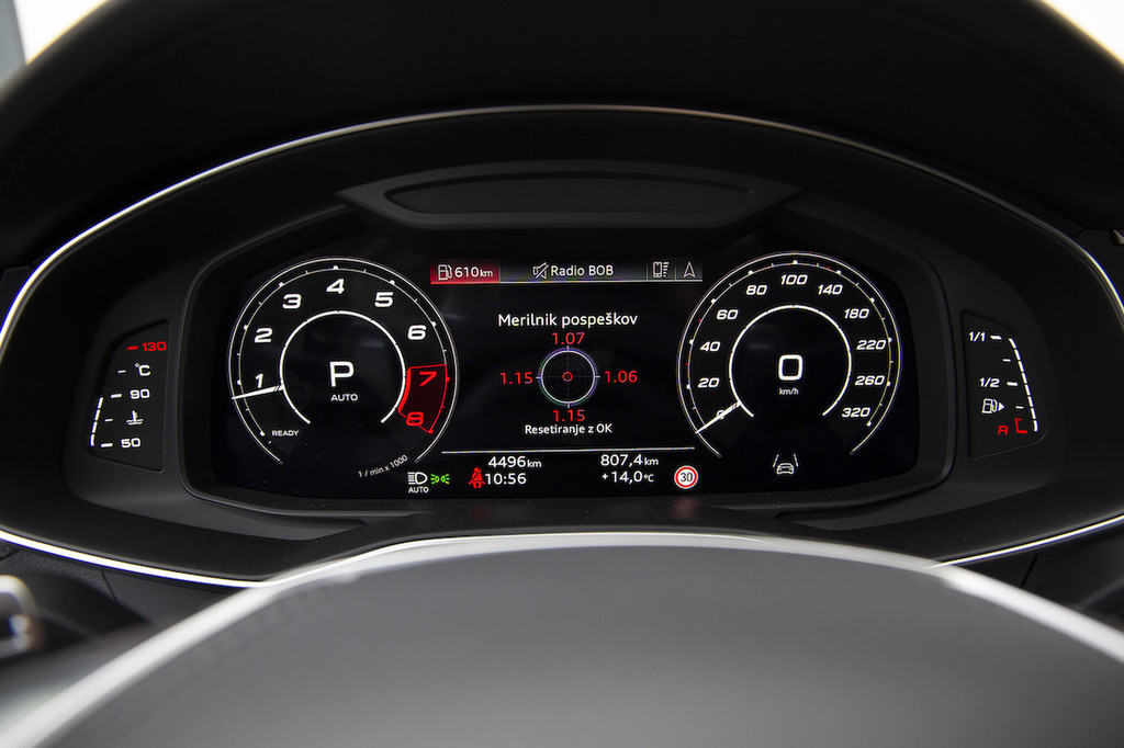 kabina, ki se od tiste pri različicah z oznako A6 razlikuje le po bolj športnih sedežih, nekaj drugih športnih detajlih, kot so rdeči šivi, predvsem pa po alkantari na volanskem obroču in na prestavni ročici. To sicer pomeni, da po vzoru klasične šestice prinaša upravljanje multimedijske in klimatske naprave z zaslonom na dotik, kar nas nikjer ne navdušuje in se nam pri tako dinamično naravnanem avtomobilu zdi še manj primerno. Toda ob tehnično tako odlični celoti mu lahko to oprostimo.