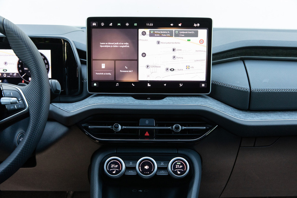 meniji, velikimi ikonami in nekaj stalnimi bližnjicami, vsemi potrebnimi povezavami ter glasovno pomočnico Lauro, ki na osnovi umetne inteligence razume naravni govor in ne le nekaterih fraz (ne, v slovenščini ne deluje). Infotainment kot celoto ocenjujem kot zelo dober, če že ne kot enega boljših, prav tako možnost brezžičnega polnjenja dveh mobilnih telefonov hkrati (moč 15 W, hlajenje preprečuje pregrevanje naprav) na za to namenjenih mestih. Ko smo ravno pri tem – tako kot za potnike in