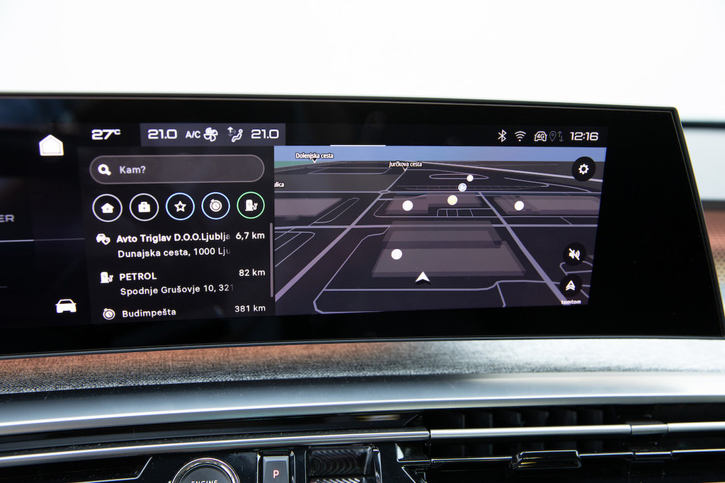 baterijski sklop z neto kapaciteto 73 kWh. Po tovarniških podatkih naj bi to zadostovalo za več kot 500 kilometrov vožnje, a ob porabi blizu 20 kWh na 100 kilometrov to ni izvedljivo. Na pretežno avtocestni poti smo jih lahko prevozili okoli 350, v mestu kakih sto več. Za tiste, ki jim to ne zadostuje, pa je e-3008 na voljo tudi z večjo, kar 98-kWh baterijo. Sodobna 400-voltna arhitektura omogoča razmeroma velike moči polnjenja, na polnilnici z enosmernim tokom celo do 160 kW, medtem ko z