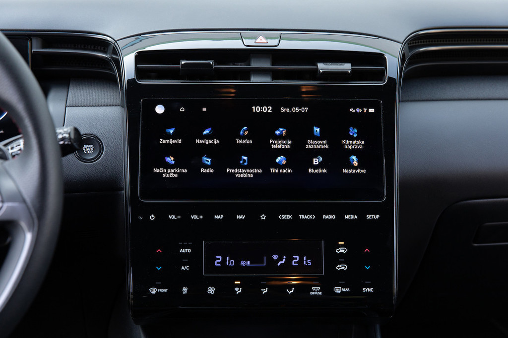 Prisilno polnjen bencinski motor s svojimi 110 kW (150 KM) je zelo zdrava in za večino voznikov ustrezna osnova – v testnem avtu je bil nadgrajen še z blagim hibridom (lahko je tudi brez), ki prispeva dobrih 16 konj in 100 Nm navora ter po drugi strani nekoliko zniža porabo goriva. Pogonski sklop se dobro ujame tudi s samodejnim menjalnikom z dvojno sklopko in sedmimi stopnjami prenosa (z vsaj sprva nekoliko nerodnim upravljanjem prek stikal) in glede na izbran vozni režim je lahko tucson z