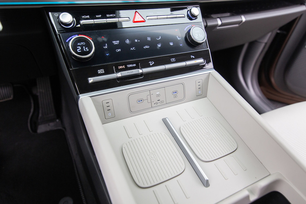 iskanja po menijih in podmenijih. Ročica menjalnika, ki je v bistvu previsno stikalo, prvič videno v ioniqu 5, je nameščena na volanski drog, kar zagotavlja veliko prostora na širokem sredinskem grebenu. Tu tako med drugim najdemo kar dve površini za brezžično polnjenje pametnih telefonov in dva priključka USB-C, pri čemer je eden namenjen polnjenju in povezavi z multimedijsko napravo, drugi pa le polnjenju. Velik predal med sedežema je mogoče odpirati tako s sprednje kot z zadnje strani,