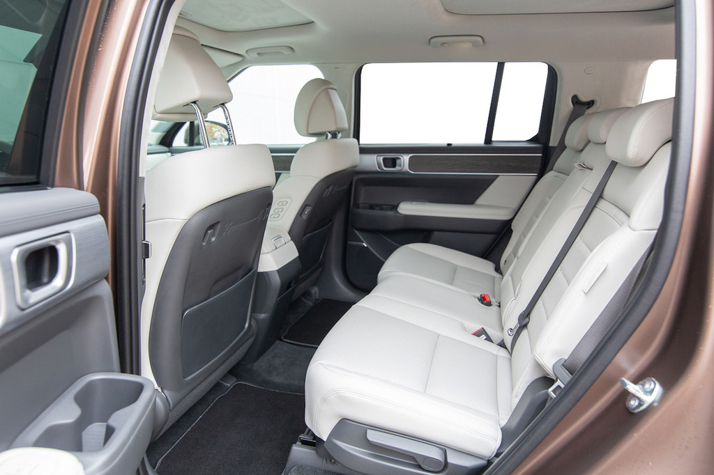 pred sovoznikom pa je poleg klasičnega zaprtega predala na voljo še en malce manjši nad njim. Navduši tudi kakovost materialov in izdelave. Praktično vse površine so mehke in prijetne na otip. Zlasti s kombinacijo svetlega usnja in lesenih okrasnih elementov tu vlada pravi premijski duh. K temu prispeva tudi dvojna steklena streha, s katero prostorna kabina deluje še bolj zračno. In prostora je res veliko, tako spredaj kot v drugi vrsti, kjer ga je na pretek tako za noge kot za glave ter v