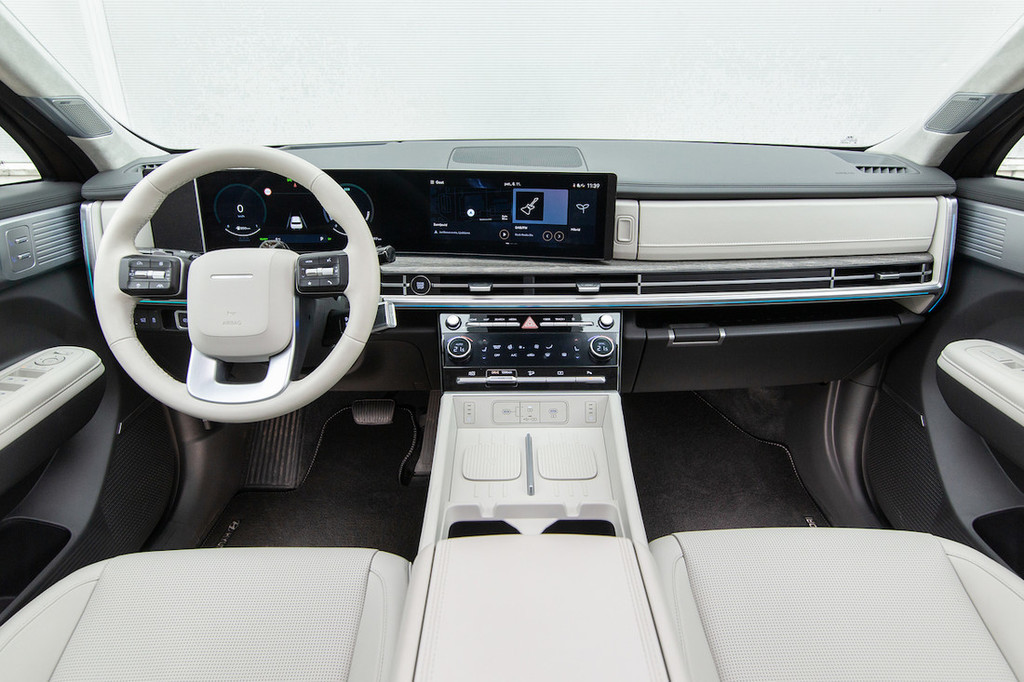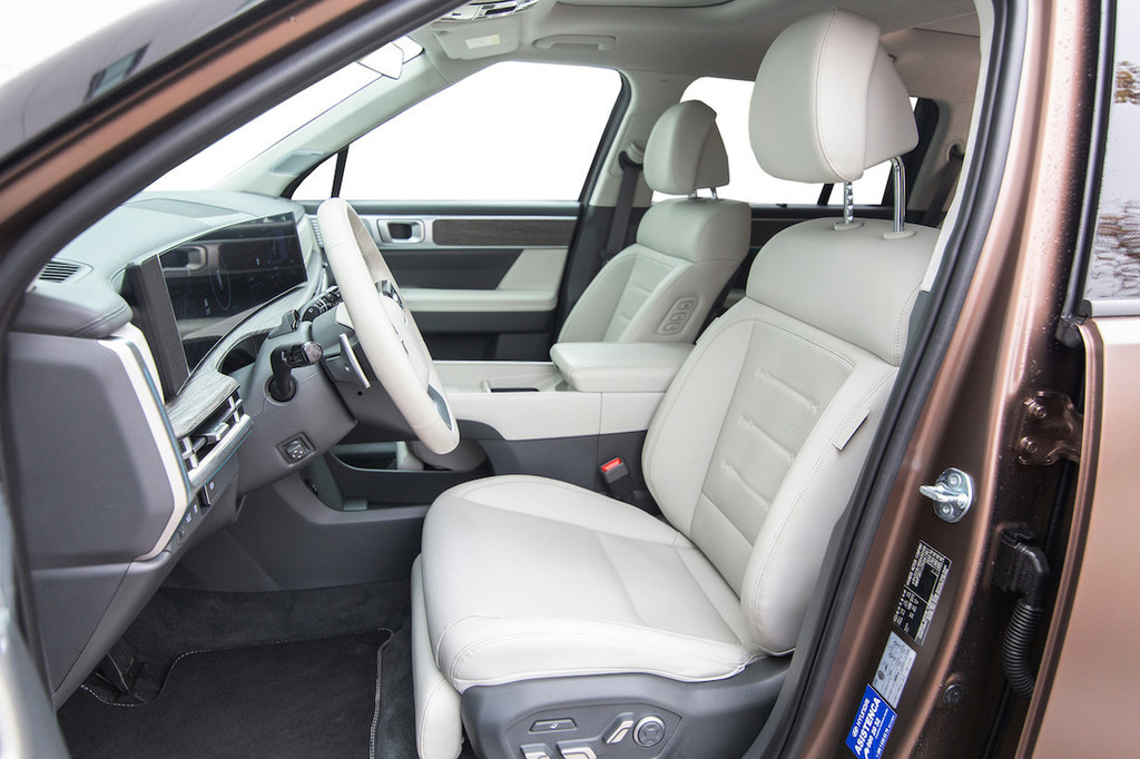 Sicer pa je notranjost novega santa fe-ja zasnovana ravno tako samozavestno kot njegova zunanjost. Tu prevladujejo vodoravne linije z velikim panelom z dvema zaslonoma v glavni vlogi. In čeprav zaslona s premerom 31,2 centimetra (12,3 palca) in manjša površina na dotik na sredinski konzoli jasno odražajo digitalno dobo, so za upravljanje multimedijske in klimatske naprave na voljo tudi klasični navadni in vrtljivi gumbi. Upravljanje osnovnih funkcij je zato neposredno in preprosto, brez