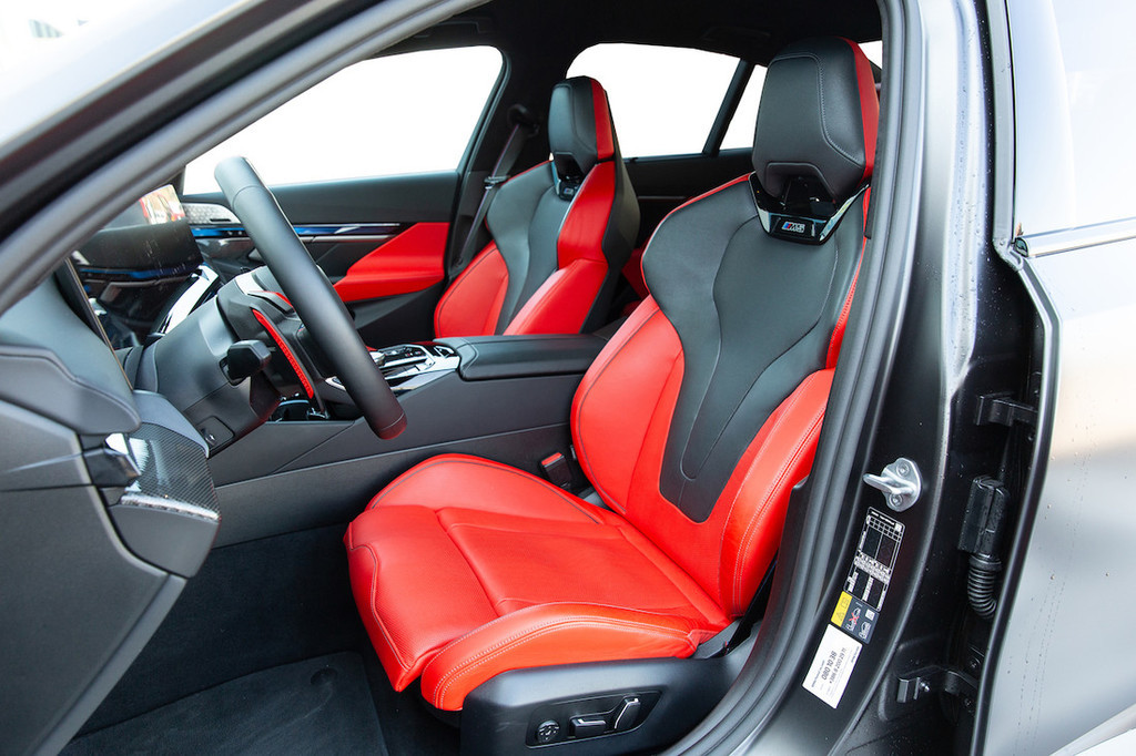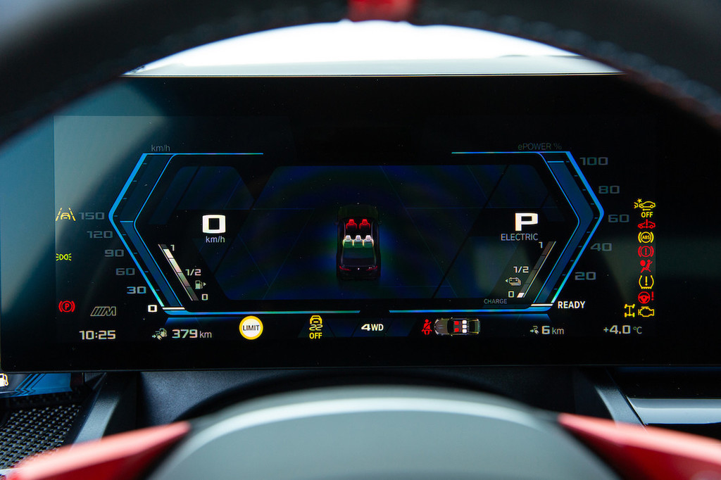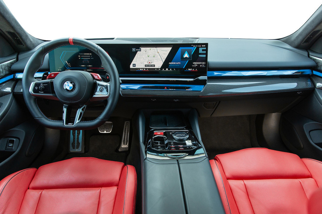 Kabino smo spoznali že pri bolj običajnih klasičnih in električnih peticah zadnje generacije. Izvedba M jo nadgrajuje predvsem z vrhunskimi športnimi sedeži in detajli, kot sta rdeča gumba M1 in M2 za priklic predhodno izbranih kombinacij nastavitev. Tu sta še večji obvolanski prestavni ročici in vmesnik s posebno grafiko ter meniji za M-dobrote. Položaj za volanom je odličen, kakovost materialov in izdelave tudi. Le ergonomija bi z več klasičnimi gumbi, zlasti za upravljanje klimatske