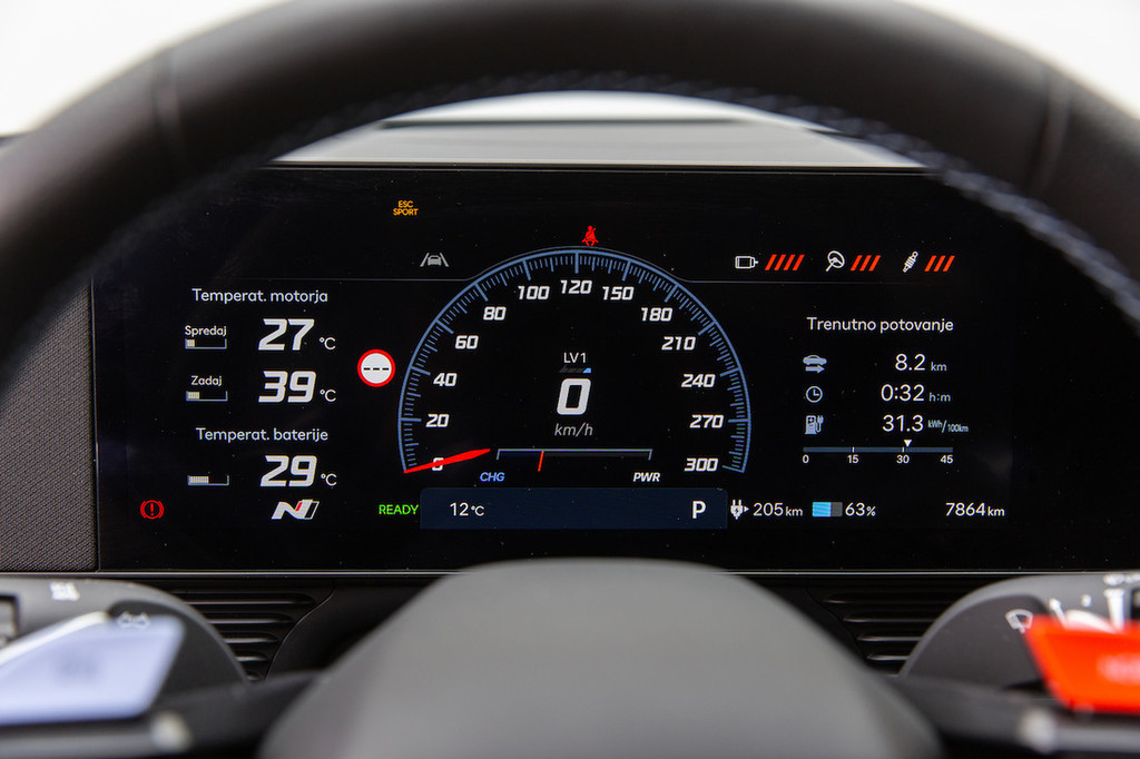 avtomobil malce zatrese, nato pa začutimo sunek v hrbet kot pri pravih športnih dvosklopčnih menjalnikih. Impresivno! Zato da je doživetje še intenzivnejše, se ob pritisku tipk N na volanu z značajem avtomobila spremeni tudi grafika instrumentne plošče, pri čemer se ob številnih podatkih, kot so temperatura motorjev in baterije, na sredini nariše merilnik navideznih vrtljajev.