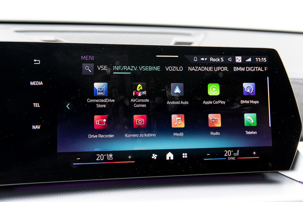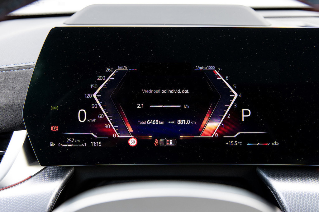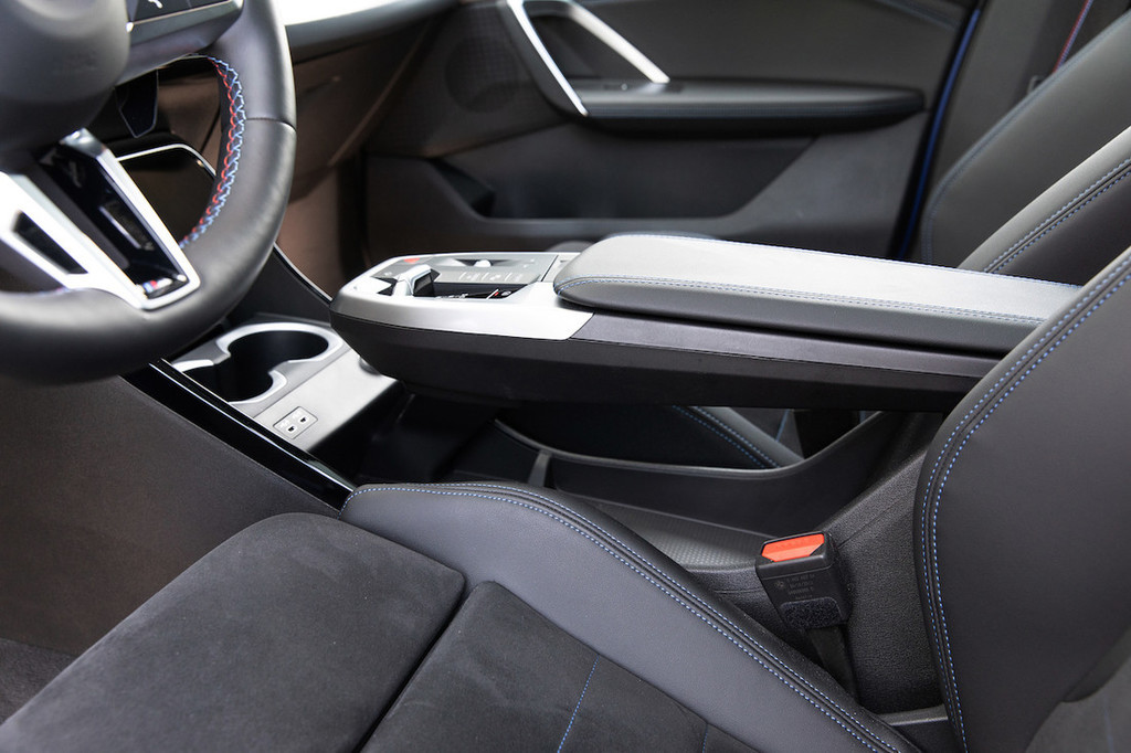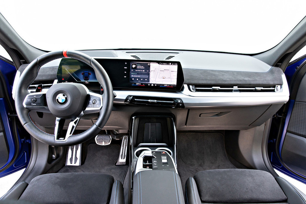 Malce bolj zmoti upravljanje klimatske naprave prek zaslona, saj je notranja arhitektura praktično enaka kot v X1 – torej brez fizičnih stikal za ta namen. Ima pa na sredinski konzoli med sedežema gumb za glasnost in izbiro voznih režimov, žal pa ne tudi vrtljivega vmesnika za upravljanje infotainmenta, kakršnega premorejo večji BMW-jevi modeli. Osrednjo vlogo zavzemata zaslon pred voznikom premera 26,2 centimetra in osrednji zaslon s 27,2 centimetra, ki ima številne aplikacije, vključno z