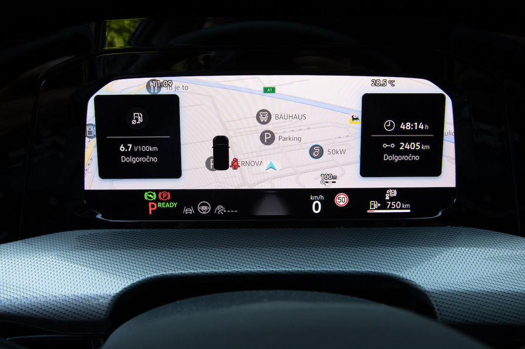 stopi na plin, avtomobil naredi to, kar ve, da je prav, da bo vozniku in potnikom udobno in bo obenem dosežena varčnost, ki jo napoveduje črka »e« ob oznaki TSI. In ta golf je res tih in uglajen ter posledično udoben. Ob tem ne moremo reči, da je podhranjen, saj doseže stotico v 8,6 sekunde in zaključi s pospeševanjem šele pri 224 km/h, toda zaradi nastavitev pogonskega sklopa se zdi ustvarjen predvsem za umirjeno vožnjo. Takrat je tudi resnično varčen. Na testu je v povprečju zahteval le 5,4