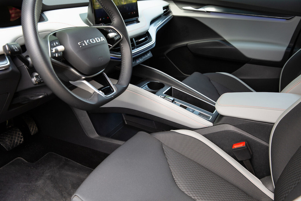 Poznana je tudi postavitev voznikovega delovnega prostora z 12,7-centimetrskim (5-palčnim) zaslonom pred voznikom, ob katerem je na voljo projekcijski zaslon z obogateno resničnostjo. Na sredini je nameščen 33-centimetrski (13-palčni) zaslon na dotik s Škodinim najnovejšim uporabniškim vmesnikom, ki vključuje asistentko Lauro s podporo umetne inteligence ChatGPT. Splošna ergonomija je dobra, a tako kot pri enyaqu bi si seveda tudi tu namesto upravljanja prek zaslona in drsnikov pod njim