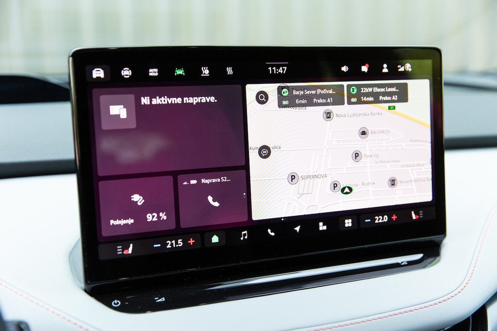 Testni enyaq, ki je bil opremljen z opcijsko toplotno črpalko, je od nas v povprečju zahteval 18,8 kWh na 100 kilometrov, kar ob bateriji z neto kapaciteto 77 kWh pomeni nekaj več kot 400 kilometrov realnega dosega. Polnjenje z izmeničnim tokom (AC) lahko poteka z največjo močjo 11 kW, na hitrih polnilnicah z enosmernim tokom (DC) pa z največ 135 kW. Mi smo na takšnih v dveh polnjenjih dosegli največjo moč 118 kW. Enyaq po prenovi potrjuje svoje vrline z nekaj stilskimi posodobitvami in
