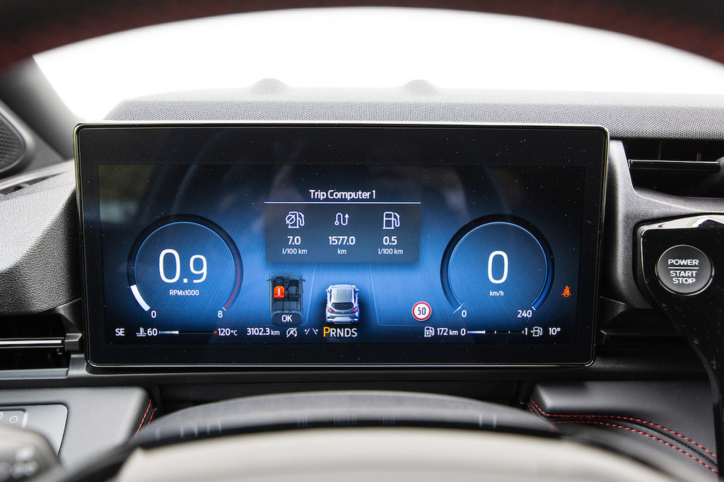 volani je tudi ta nekako nenaravne oblike in zahteva vsaj malce privajanja. Mi smo pogrešali prejšnjega, vključno z dvema obvolanskima ročicama, ki so se ju pri Fordu odločili združiti v eno na levi. Ta po našem mnenju precej po nepotrebnem zdaj skrbi za preveč funkcij in bi raje videli, če tu ne bi varčevali tako kot pri nekaterih materialih v notranjosti, ki so malenkost preveč plastični.