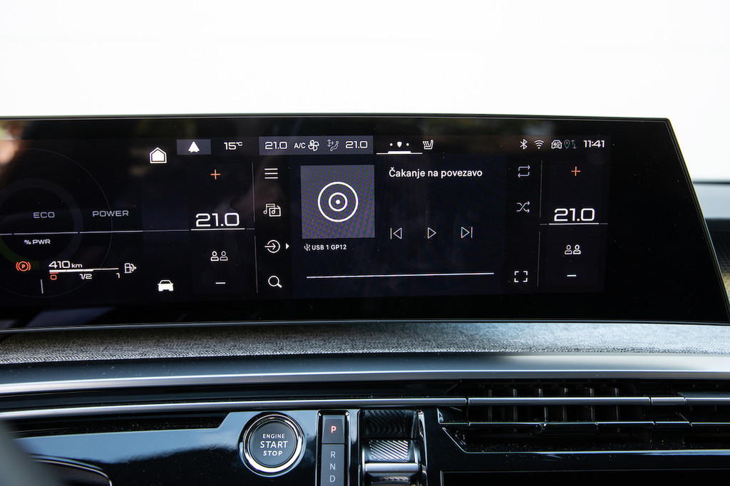 Sicer pa v notranjosti hvalimo kakovost materialov in izdelave, ki je na visoki ravni. Malce smo zadržani le glede svetlega blaga na armaturni plošči, ki bi ob dolgotrajni uporabi utegnilo biti občutljivo za madeže in umazanijo. Ker gre za model, ki temelji na večenergijski platformi STLA medium, tokratna testna tritisočosmica ni bila popolnoma električna, temveč je pod pločevino skrivala blagi hibrid. Tega sestavljajo 1,2-litrski turbobencinski trivaljnik s 100 kW (136 KM) in v