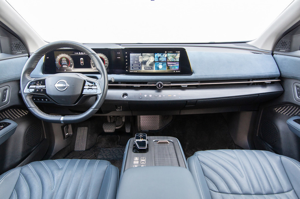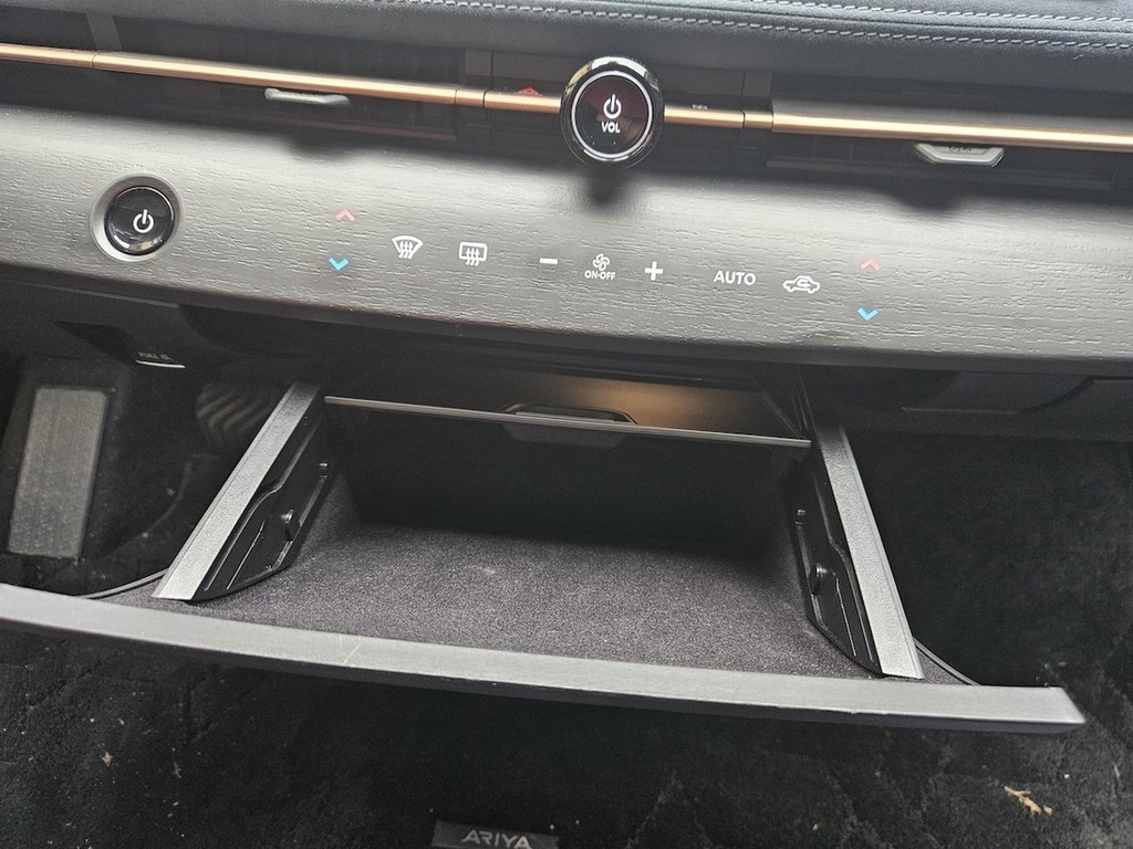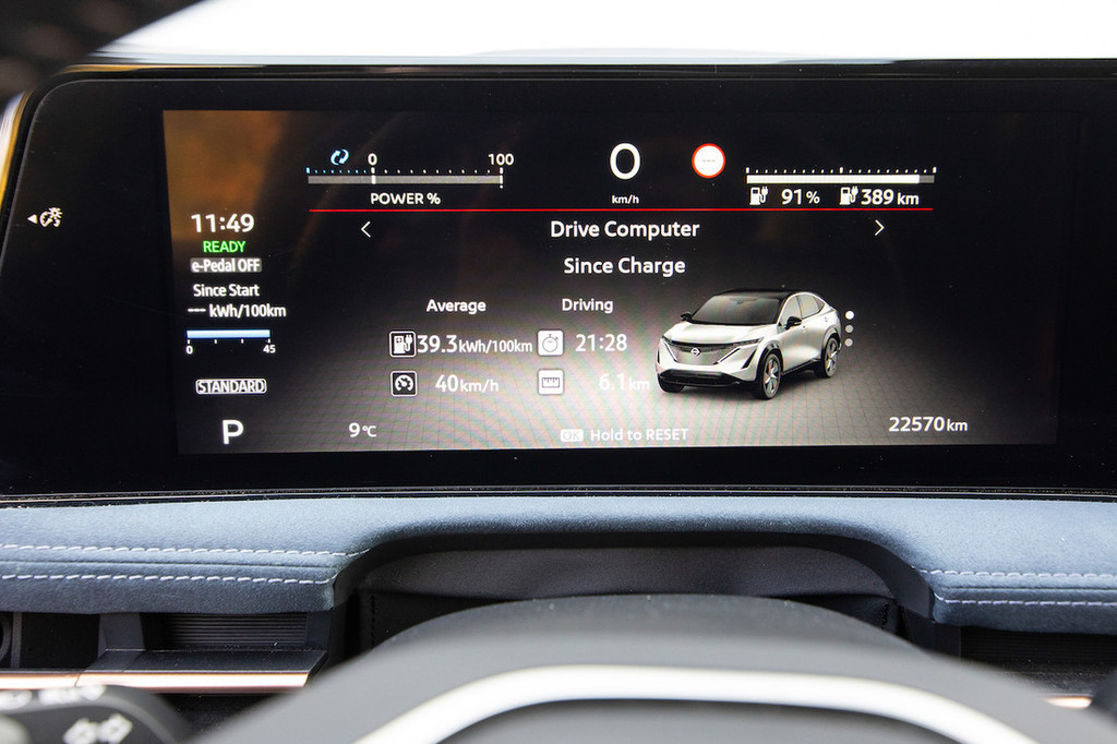 konzole, ki sta skoraj na tleh, ter površine za brezžično polnjenje, ki je skrita pod naslonom za roke. Objektivno bolj moteča pa je grafika oziroma slaba ločljivost dveh 31,2-centimetrskih (12,3-palčnih) zaslonov v okviru enotnega vodoravnega panela, ki razkriva, da ariya v resnici ni čisto nov avtomobil. Tudi meniji in logika delovanja vmesnika so razmeroma zapleteni, zaradi česar celota v primerjavi s tekmeci deluje malce zastarelo.