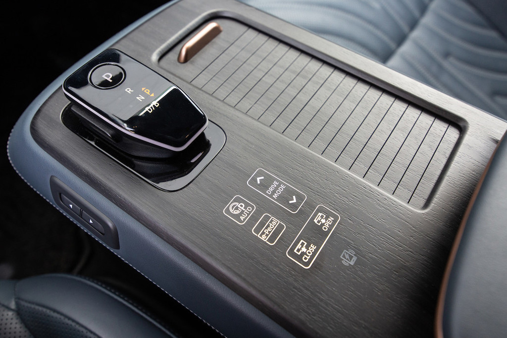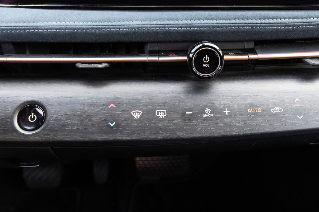 glavnih funkcij klimatske naprave, ki postanejo zares vidna šele ob zagonu, ko zaživijo z osvetlitvijo. Podobna so haptična stikala (za vklop sistema za samodejno parkiranje, sistema e-pedal za izbiro voznih načinov in za električno odpiranje oziroma zapiranje predala v armaturni plošči) na sredinski konzoli, ki dajejo precej grobo in umetno povratno informacijo, s čimer ne delujejo nič kaj prijetno. Ergonomsko vprašljiva je tudi namestitev USB priključkov na spodnjem sprednjem delu sredinske