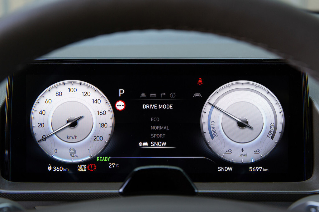 Armaturno ploščo sestavljata dva zaslona premera 26 centimetrov; eden opravlja vlogo merilnikov, prilagojenih potrebam električnega pogona, drugi je za upravljanje infotainmenta in nekaterih drugih funkcij. Kot rečeno, za večino funkcij skrbijo fizična stikala, kar uporabniško izkušnjo povzdiguje na višjo raven. V sklopu mnogih odlagalnih površin je tudi površina za brezžično polnjenje telefona, s seznama doplačil pa tudi 220-voltna vtičnica za napajanje zunanjih naprav, na primer kavnega