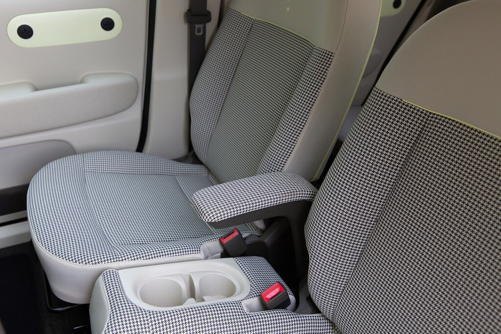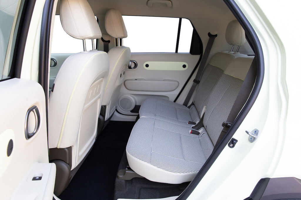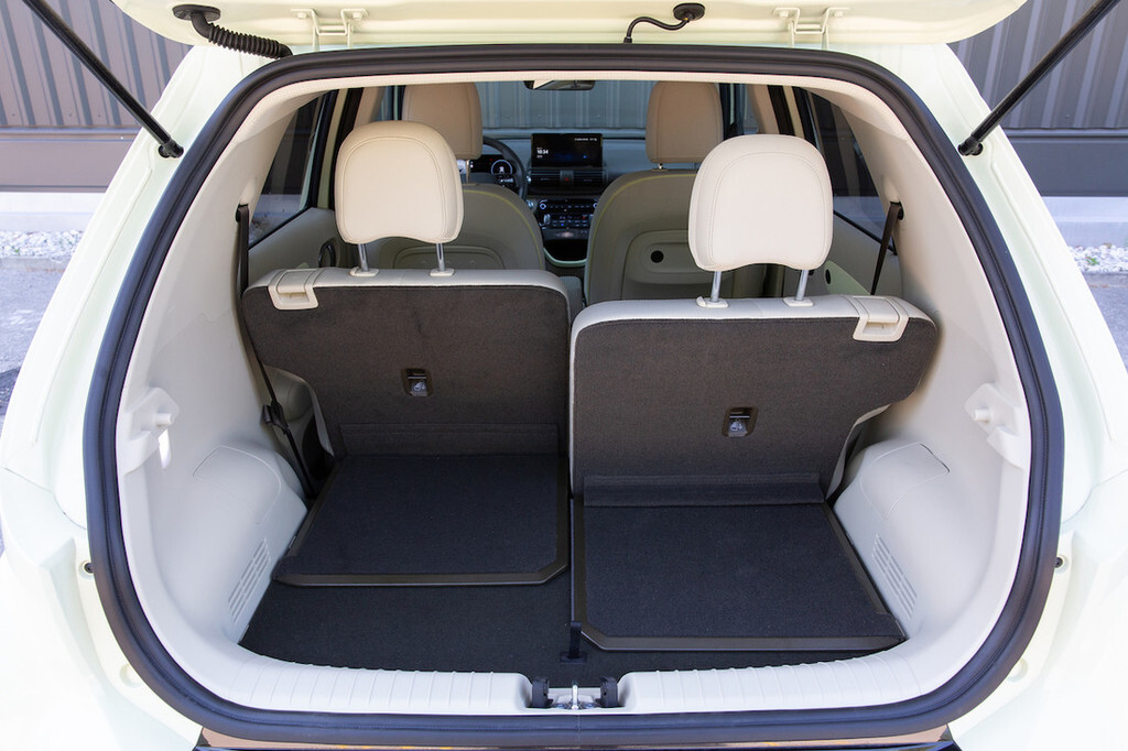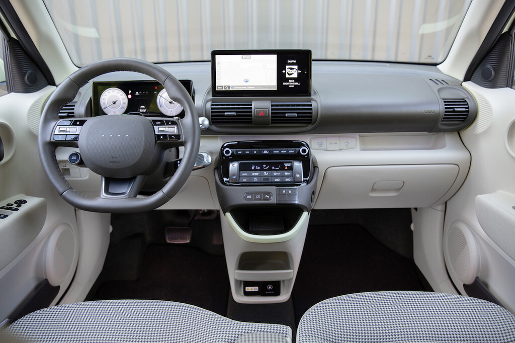Drzno oblikovana, a kompaktna zunanjost se v notranjosti ne občuti prav močno. Če kje, je nekoliko tesno predvsem v širino, kjer je inster precej ožji od tekmecev. Na sprednji klopi so zato inženirji uporabili zanimivo rešitev skorajda spojenih sedišč brez sredinskega kanala. To mu seveda omogoča električna zasnova, katere največji prostorski zahtevek (baterije) se skriva v dnu in nikakor ne posega v kabinski prostor. Ker tudi zadaj lahko sedita največ dva potnika vštric, je situacija podobna
