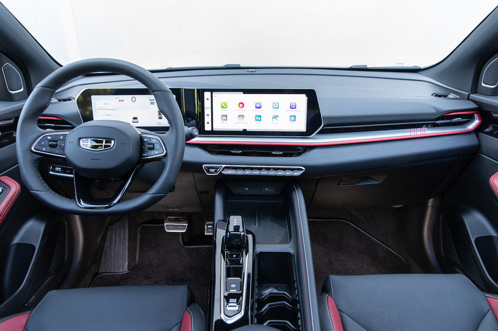 Kabina je prostorsko razmeroma radodarno odmerjena, pa tudi pelje se coolray prav solidno, še posebej ob bolj umirjenem vozniku. Pri udobju mu ni kaj očitati, pri višjih hitrostih v ovinkih pa se malce bolj nagiba, k dinamiki ne spodbuja niti precej sterilen volan. Enako velja za pogonski sklop, kombinacijo sicer zmogljivega 1,5-litrskega turbo motorja s 128 kW (174 KM) in samodejnega dvosklopčnega menjalnika s sedmimi stopnjami prenosa, saj takrat deluje precej neusklajeno, kar pomeni veliko