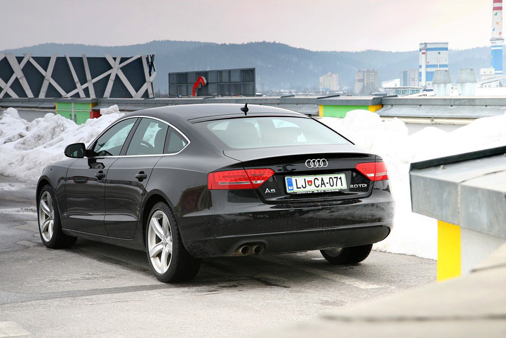 Vsi dobro poznamo kupejevsko izvedbo audija A5. Nedvomno gre za najlepše oblikovan izdelek Audija v zadnjem času, ki je skladno z modo sedaj dobil še večjega polbrata. Kaj pravzaprav A5 sportback je? Kupe kot že rečeno ne more biti, ker ima en par bočnih vrat preveč. Za limuzino je zadek preveč položen, shooting brake pa tudi ni, ker nima treh vrat in v osnovi ni namenjen, tako kot včasih, petičnežem za prevoz palic za golf ali pušk za lov na lisice. Oblikovno je A5 sportback še najbližje dobri stari limuzini s petimi vrati, ki so ji v Ingolstadtu nadeli kupejevsko streho in na hrbet poveznili športen nahrbtnik. Končni izdelek je tako še najbolj podoben izdelku kakšnega priznanega umetnika in ne kupu železja s štirimi krogi na nosu. Oblikovalci so si drznili prestopiti utrjene meje in moram reči, da spoštujem njihov pogum. Vse skupaj bi se lahko končalo na pogorišču zgodovine, tako pa so pri Audiju še enkrat več dokazali, da z minimalnimi prijemi lahko ustvarijo pravo mojstrovino. Zunanjost se praktično ne ponaša z nobeno revolucionarno rešitvijo, elegantno-športen prizvok celotni kompoziciji vdahnejo, poleg seveda prej omenjene kupejevske strehe, šele luči v led tehniki in velika platišča.