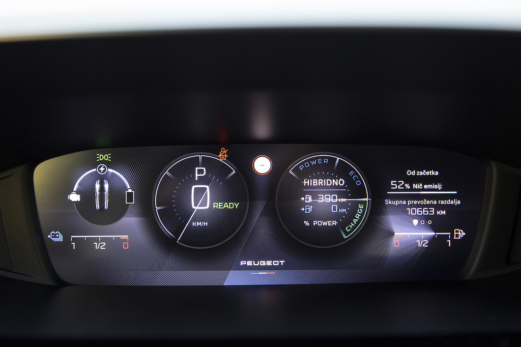 A prednosti priključnega hibrida se tu šele začnejo, saj nič manj ne navduši možnost popolnoma električne vožnje. Ker gre za nizko aerodinamično vozilo, ne pa modni SUV, je poraba ugodnejša. Električni doseg z 12,4-kWh baterijskim sklopom tako lahko znaša do 60 kilometrov, čeprav je ob nepazljivi vsakdanji vožnji ta bližje 40–50 kilometrom. Peugeot pri tem modelu ne omogoča hitrega polnjenja z enosmernim tokom (DC), ampak le z izmeničnim. Je pa vseeno glede na velikost baterije tudi največja