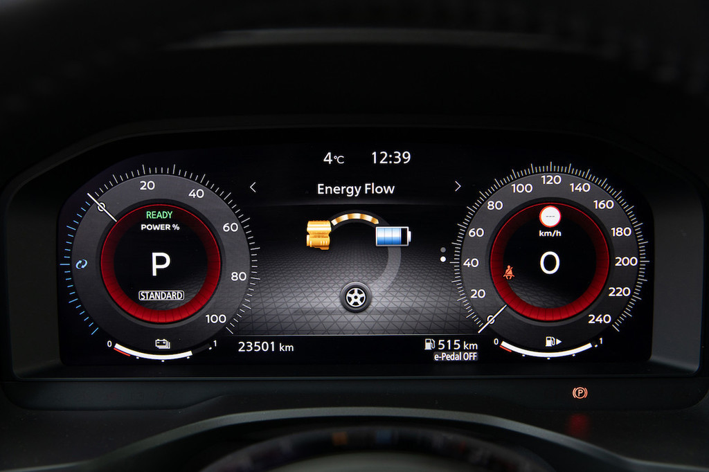 ima še tako bogat nabor zmogljive elektronike, to ni nič v primerjavi s pogonskim sklopom z oznako e-power. Gre za razmeroma kompliciran električno-bencinski hibridni sklop s skromno baterijo kapacitete 2,1 kWh, ki jo prek generatorja in inverterja sproti napaja inovativen 1,5-litrski bencinski motor z mehansko prilagodljivim kompresijskim razmerjem. Kolesa pa zares poganjata le električna motorja, na sprednji osi s 150 kW (204 KM), zadaj pa skromnejši z močjo 100 kW (136 KM). Sistemska