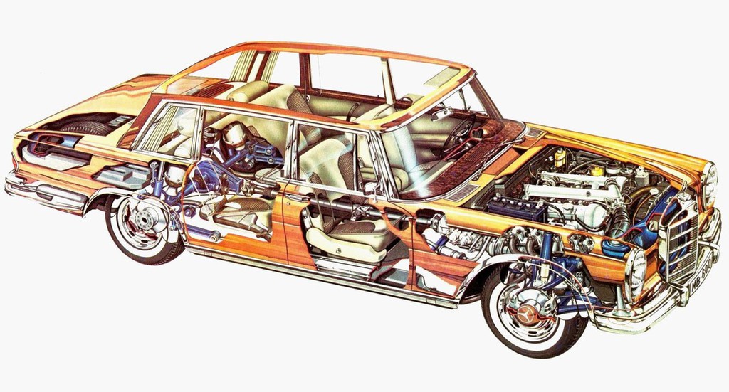 Za vse to so poskrbele takratne 'high-tech' novosti (med vožnjo nastavljiva prilagoditev trdote blažilnikov, štiri kolutne zavore, dvokrožni zavorni sistem s podporo pritiska zraka, zračno vzmetenje, servo volanski mehanizem, centralno zaklepanje, elektronsko nadzorovano gretje in hlajenje potniškega prostora, hidravlično podprto odpiranje bočnih kabinskih stekel, prtljažnika in nastavitev zadnjih sedežev…), seveda pa si je naročnik lahko omislil tudi avtotelefon, TV sprejemnik in vse ostale pridobitve tedanje IT dobe. Pod motornim pokrovom tega impozantnega avtomobila (dolžina: 5540 mm (4-door Limousine), širina: 1950 mm, višina: 1510 mm, medosna razdalja: 3200 mm, masa avtomobila: 2605 kg), ki so ga Nemci kupcem ponujali v več različnih različnih karoserijskih različicah (4-door Limousine, 4-door Pullman Limousine, 6-door Pullman Limousine, 4-door Landaulet in 4-door Pullman Landaulet), se skriva prvi Mercedes-Benzov serijsko vgrajeni bencinski V8 motor, ki so ga Nemci nadgradili z elektronskim vbrizgavanjem goriva. Obstajata pa tudi dva kupeja, ki imata danes astronomsko vrednost.