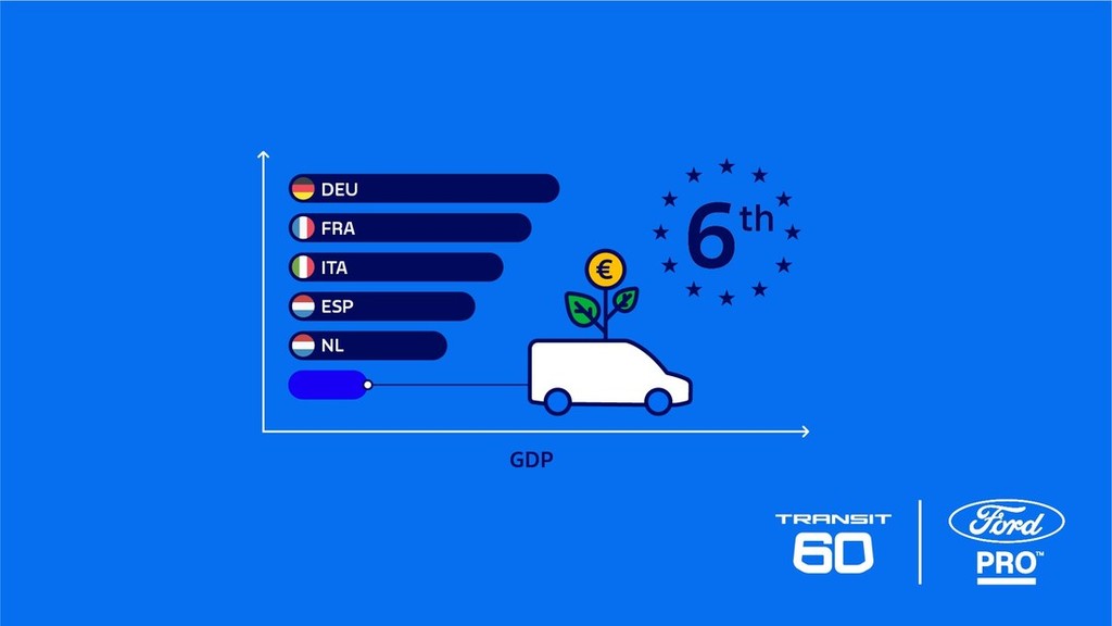 Na koledarju je pisalo 9. avgust 1965, v Fordovi tovarni v Langleyju v Veliki Britaniji pa je s proizvodne linije zapeljal prvi dostavnik Ford Transit. Takrat si je le malokdo predstavljal, kakšen vpliv bo imelo to novo dostavno vozilo na podjetja in gospodarstva v prihodnjih desetletjih. Če bi bila podjetja, v katerih imajo dostavna vozila pomembno vlogo, dejansko država članica EU, bi se leta 2023 po BDP uvrstila na šesto mesto – pred države, kot so Avstrija, Irska ali Švedska, je razvidno iz poročila, ki ga je naročil Ford Pro, objavil pa Center za ekonomske in poslovne raziskave (Centre for Economics and Business Research – Cebr).1 Leta 2025, ko praznujemo 60 let neprekinjene proizvodnje Transita, so Transit in dostavniki, ki so nastali po njegovem navdihu, v središču gospodarske rasti po vsej Evropi. Transit je še naprej zaupanja vreden partner, na katerega se lahko vedno zaneseta tako lokalni pek kot čebelar, pa tudi podjetja za dostave paketov in kurirske storitve po vsej državi.