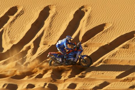 Med motoristi se je mladi Cyril Despres šele dobro razveselil prvega mesta v skupnem seštevko, ko je že moral predati vodstvo Špancu Juanu Romi, ki je bil na osmi etapi najhitrejši. Sainct se je namreč kmalu po štartu popolnoma izgubil in je sedaj skupno na sedmem mestu. Tudi tako izkušeni motoristi kot je Meoni so imeli svoj del navigacijskih napak, saj je Italijan osvojil šele peto mesto. No, mnogo bolj epa je šlo našemu puščavskemu lisjaku, ki je danes zasedel 14. mesto in je skupno šestnajsti. "Tako težke etape še nisem vozil, priznam, da sem tokrat pomislil, da ne bom zmogel. Peščeni vihar je onemogočal vidljivost, vroč veter je povzročal dehidracijo, toliko skal, peska, sipin, kamelje trave na enem kupu še nisem videl. Za povrh pa je bilo v potni knjigi še polno napak, zaradi katerih so se mnogi popolnoma izgubili. Proti koncu mi je še odpovedal akumulator, tako da sem moral počakati na pomoč (kakšnih 8 minut), da sem s kabli lahko zagnal motor. Sedaj moram v taboru najti nov akumulator, kar pa ni najlažje, saj danes asistenčnih tovornjakov ne bo "domov", še dodaja Miran, ki se je odličnega rezultata zelo razveselil.