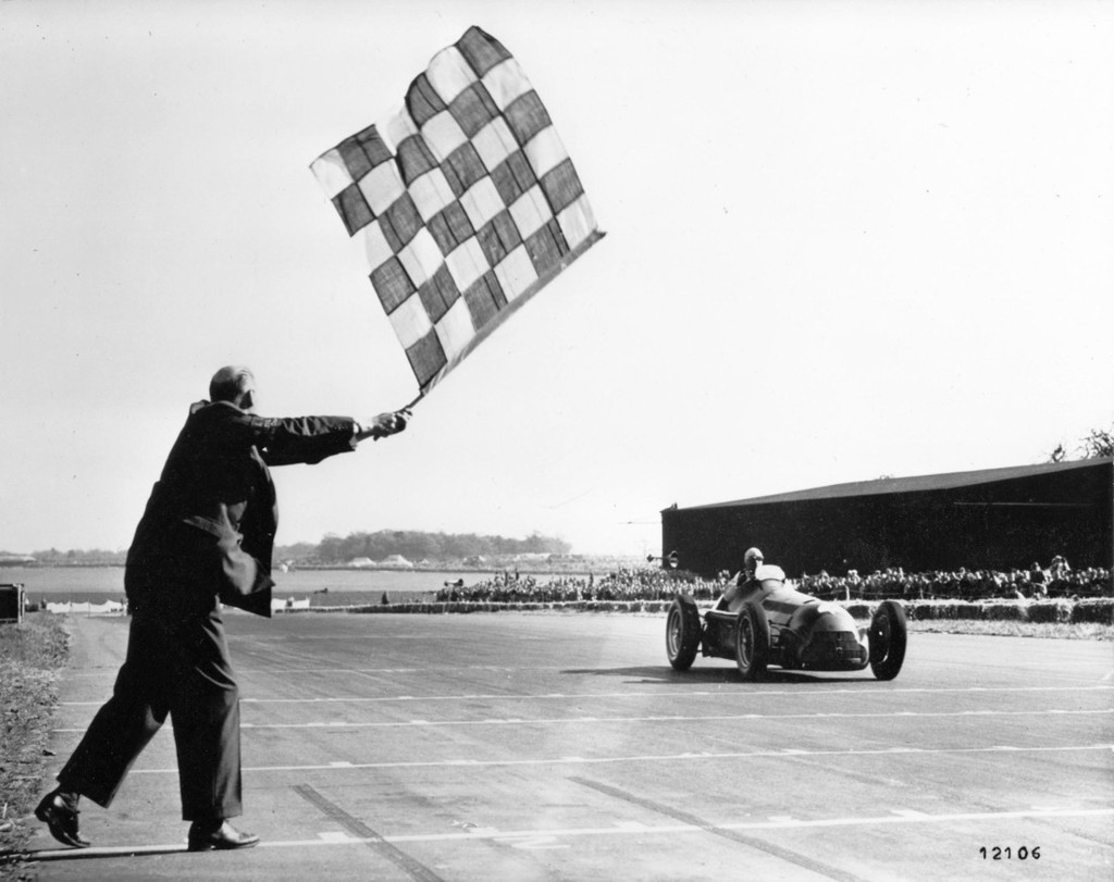 Čeprav so uradna pravila igre za formulo 1 nastala že leta 1946, so organizatorji izvedbo prve dirke načrtovali šele za leto 1948, vendar je do nje prišlo šele leta 1950, ko je FIA (Fédération Internationale de l'Automobile) sprožila nastanek svetovnega prvenstva formule 1, ki so ga izvedli na šestih dirkalnih stezah v Evropi, istočasno so dirkači enkrat letno tekmovali preko 'velike luže' na legendarni ameriški dirki Indianapolis 500. Že prva uvodna dirka formule 1, ki se je odvijala na območju nekdanjega britanskega vojaškega letališča v bližini vasice Silverstone, je pritegnila več kot 100.000 gledalcev. Med njimi se je nahajala tudi britanska kraljeva družina, zato je bil ravno tedanji britanski kralj George VI na koncu 70 krogov dolge dirke tisti, ki je tekmovalce pozdravil s črno-belo karirasto zastavico. Kasneje je celo obiskal vse dirkače in jim osebno čestital za dosežene uvrstitve na dirki.