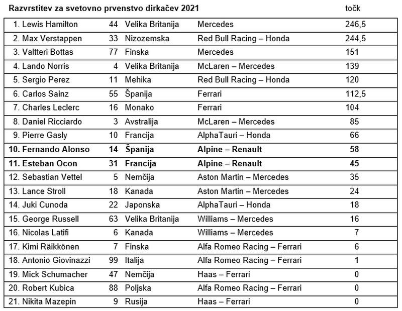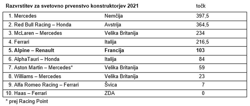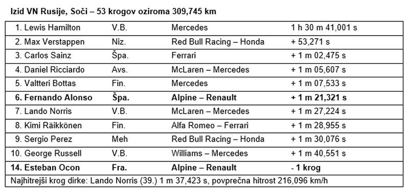 Moštvo Alpine F1 je svoj niz osvajanja točk podaljšalo na štirinajst dirk, saj je Fernando Alonso osvojil šesto mesto v razburljivi dirki za VN Rusije na dirkališču v Sočiju. Esteban Ocon tokrat ni osvojil točk, saj je bil štirinajsti. Dirka se je začela na suhi in zaključila na razmočeni stezi. Le nekaj krogov pred ciljem je namreč pričelo deževati, kar je vsem prineslo hudo dilemo med tveganim nadaljevanjem z gladkimi pnevmatikami do cilja in časovno izgubo zaradi postanka za namestitev pnevmatik za dež. Na koncu sta se oba dirkača odločila za prehodne pnevmatike za mokro stezo, kar je Alonsu omogočilo osvojitev šestega mesta in dragocenih osmih točk za svetovno prvenstvo.