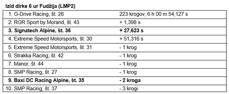 Nicolas Lapierre je do cilja ostal v vodilni trojici, pripravljen, da izkoristi vsako možnost, ki bi jo ponudili posadki drikalnikov G-Drive številko 26 ali RGR s številko 43. Tretje mesto v razredu LMP2 na koncu dirke je bil odličen izkupiček za moštvo Signatech-Alpine, ki je tako v skupni razvrstitvi izgubilo samo tri točke prednosti pred najbližjim tekmecem za naslov prvaka. Posadka Baxi DC Racing Alpine s številko 35 je z zelo dobrimi časi v zaključnem delu dirke dosegla deveto mesto. Po izmeni Davida Chenga je za zadnjih nekaj krogov dirkalnik prevzel Ho-Pin Tung in bil hitrejši celo od vodilnih posadk, ki so se še vedno potegovale za zmago!