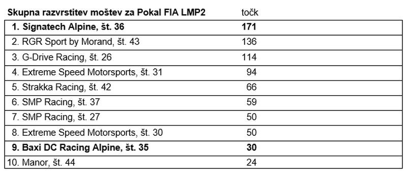 Moštvo Signatech-Alpine v skupni razvrstitvi še naprej vodi s 171 točkami in zajetno prednostjo 35 točk pred drugouvrščenim. Baxi DC Racing Alpine je s 24 točkami na devetem mestu. Naslednja dirka vzdržljivostnega prvenstva FIA WEC bo 6. novembra v Šanghaju.